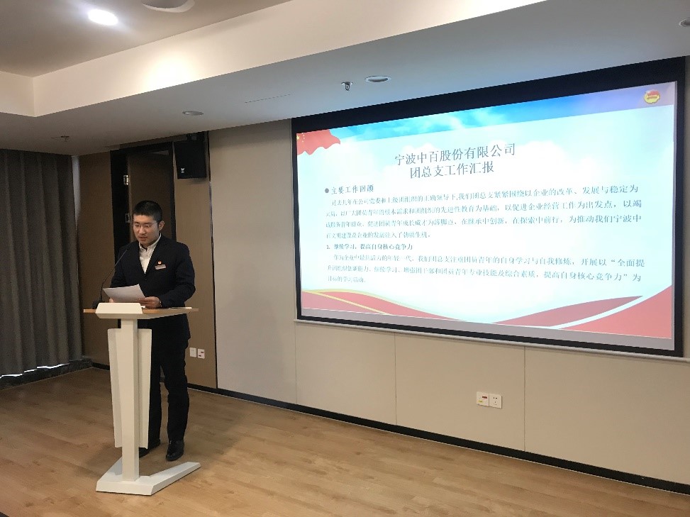2018年11月20日,共青團寧波中百股份有限公司總支委員會召開全體團員大會,進行換屆選舉。會議在莊嚴肅穆的國歌聲中正式開始,團總支書記陳佳琦代表上屆團總支作工作報告。