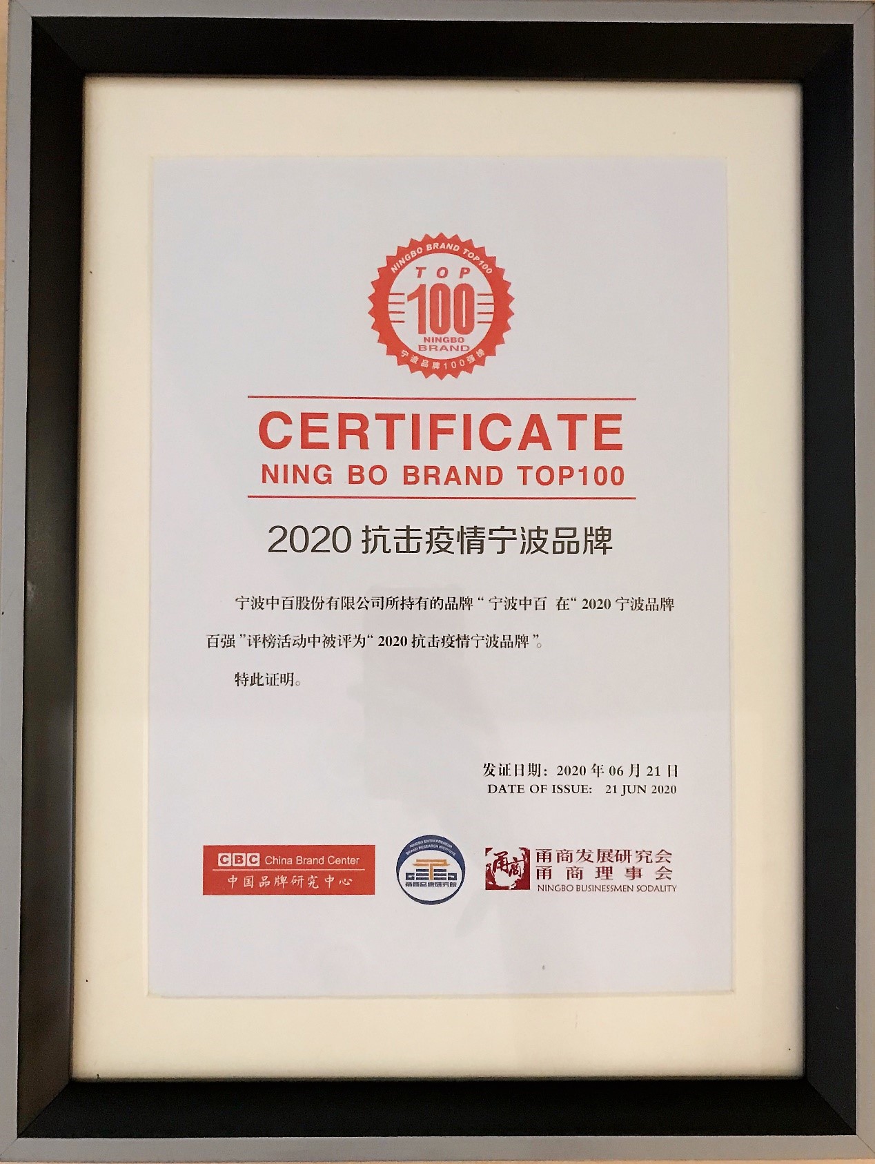 6月21日下午,在由“中國(guó)品牌研究中心”、“甬商發(fā)展研究會(huì)”、“甬商聯(lián)合會(huì)”聯(lián)合舉辦的“2020寧波品牌”授牌儀式上,我公司被授予“2020抗擊疫情寧波品牌”,寧波二百(公司全資子公司)被授予“2020寧波品牌百?gòu)?qiáng)”(二百品牌價(jià)值為34.4億元)!